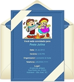 Abaixo estao os Modelos de Convites Festa Junina gratis oferecidos pelo www.ToDentro.com. Clique em um convite para ver o tamanho completo. Importar a sua foto individual ou usar uma foto disponivel na ToDentro.com. ToDentro.com ajuda voce a planejar seu evento do inicio ao fim de partida com um convite personalizado e gratuito. Escolha o seu convite de muitos modelos convites Festa Junina disponiveis, importar os e-mails de seus convidados, e enviar. Seus convidados podem resposta, escreva um comentario, e registre-se para levar um item de a sua Lista de Pedidos. Depois da festa, importar suas fotos para a sua pagina convite e convidar seus